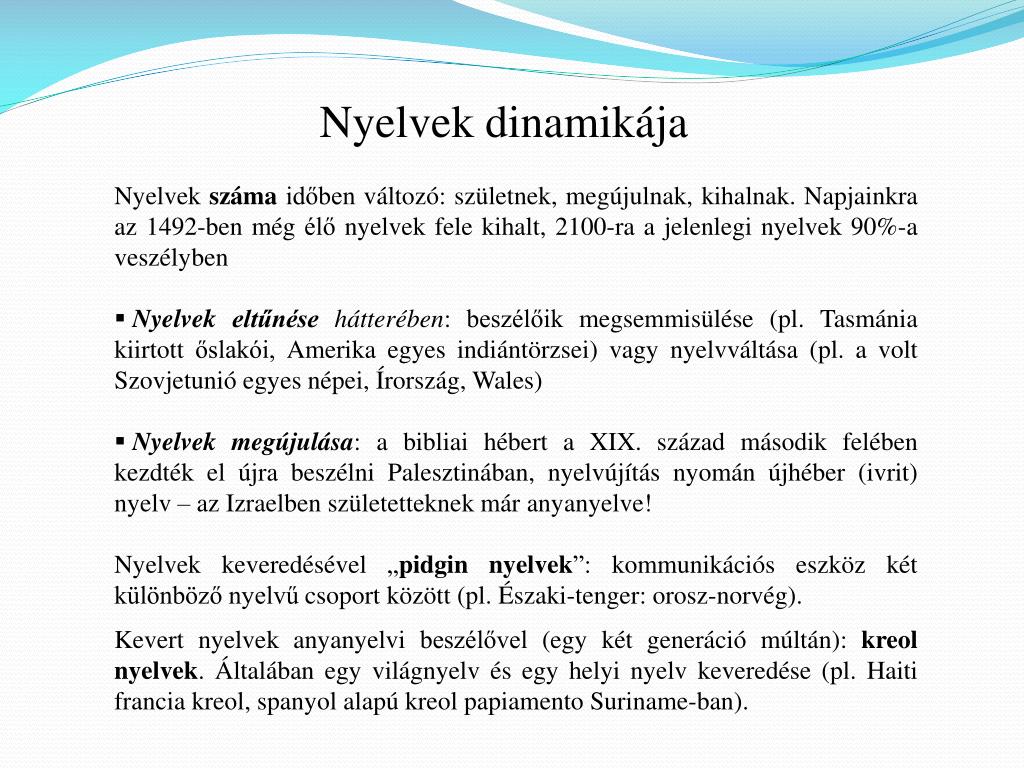 Nyelvek dinamikája • Nyelvek száma időben változó: születnek, megújulnak, kihalnak. Napjainkra az 1492-ben még élő nyelvek fele kihalt, 2100-ra a jelenlegi nyelvek 90%-a veszélyben • Nyelvek eltűnése hátterében: beszélőik megsemmisülése (pl. Tasmánia kiirtott őslakói, Amerika egyes indiántörzsei) vagy nyelvváltása (pl. a volt Szovjetunió egyes népei, Írország, Wales) • Nyelvek megújulása: a bibliai hébert a XIX. század második felében kezdték el újra beszélni Palesztinában, nyelvújítás nyomán újhéber (ivrit) nyelv – az Izraelben születetteknek már anyanyelve! • Nyelvek keveredésével „pidgin nyelvek”: kommunikációs eszköz két különböző nyelvű csoport között (pl. Északi-tenger: orosz-norvég). • Kevert nyelvek anyanyelvi beszélővel (egy két generáció múltán): kreol nyelvek. Általában egy világnyelv és egy helyi nyelv keveredése (pl. Haiti francia kreol, spanyol alapú kreol papiamentoSuriname-ban).