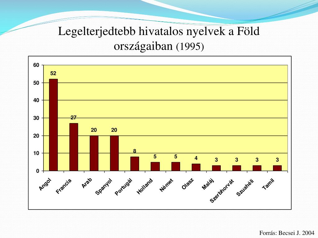 Legelterjedtebb hivatalos nyelvek a Föld országaiban (1995) Forrás: Becsei J. 2004