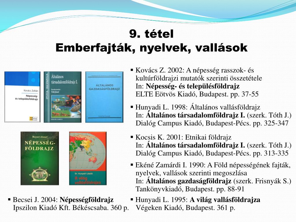 9. tétel Emberfajták, nyelvek, vallások • Kovács Z. 2002: A népesség rasszok- és • kultúrföldrajzi mutatók szerinti összetétele • In: Népesség- és településföldrajz • ELTE Eötvös Kiadó, Budapest. pp. 37-55 • Hunyadi L. 1998: Általános vallásföldrajz • In: Általános társadalomföldrajz I. (szerk. Tóth J.) • Dialóg Campus Kiadó, Budapest-Pécs. pp. 325-347 • Kocsis K. 2001: Etnikai földrajz • In: Általános társadalomföldrajz I. (szerk. Tóth J.) • Dialóg Campus Kiadó, Budapest-Pécs. pp. 313-335 • Ekéné Zamárdi I. 1990: A Föld népességének fajták, • nyelvek, vallások szerinti megoszlása • In: Általános gazdaságföldrajz (szerk. Frisnyák S.) • Tankönyvkiadó, Budapest. pp. 88-91 • Becsei J. 2004: Népességföldrajz • Ipszilon Kiadó Kft. Békéscsaba. 360 p. • Hunyadi L. 1995: A világ vallásföldrajza • Végeken Kiadó, Budapest. 361 p.