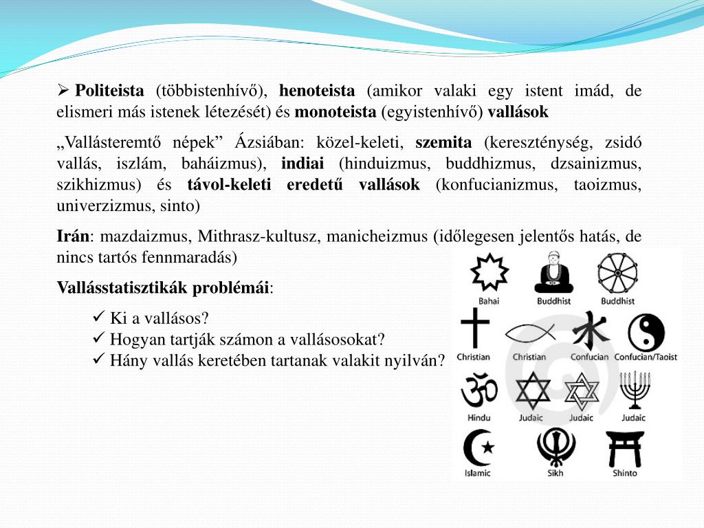 Politeista (többistenhívő), henoteista(amikor valaki egy istent imád, de elismeri más istenek létezését) és monoteista (egyistenhívő) vallások • „Vallásteremtő népek” Ázsiában: közel-keleti, szemita (kereszténység, zsidó vallás, iszlám, baháizmus), indiai (hinduizmus, buddhizmus, dzsainizmus, szikhizmus) és távol-keletieredetű vallások (konfucianizmus, taoizmus, univerzizmus, sinto) • Irán: mazdaizmus, Mithrasz-kultusz, manicheizmus (időlegesen jelentős hatás, de nincs tartós fennmaradás) • Vallásstatisztikák problémái: • Ki a vallásos? • Hogyan tartják számon a vallásosokat? • Hány vallás keretében tartanak valakit nyilván?