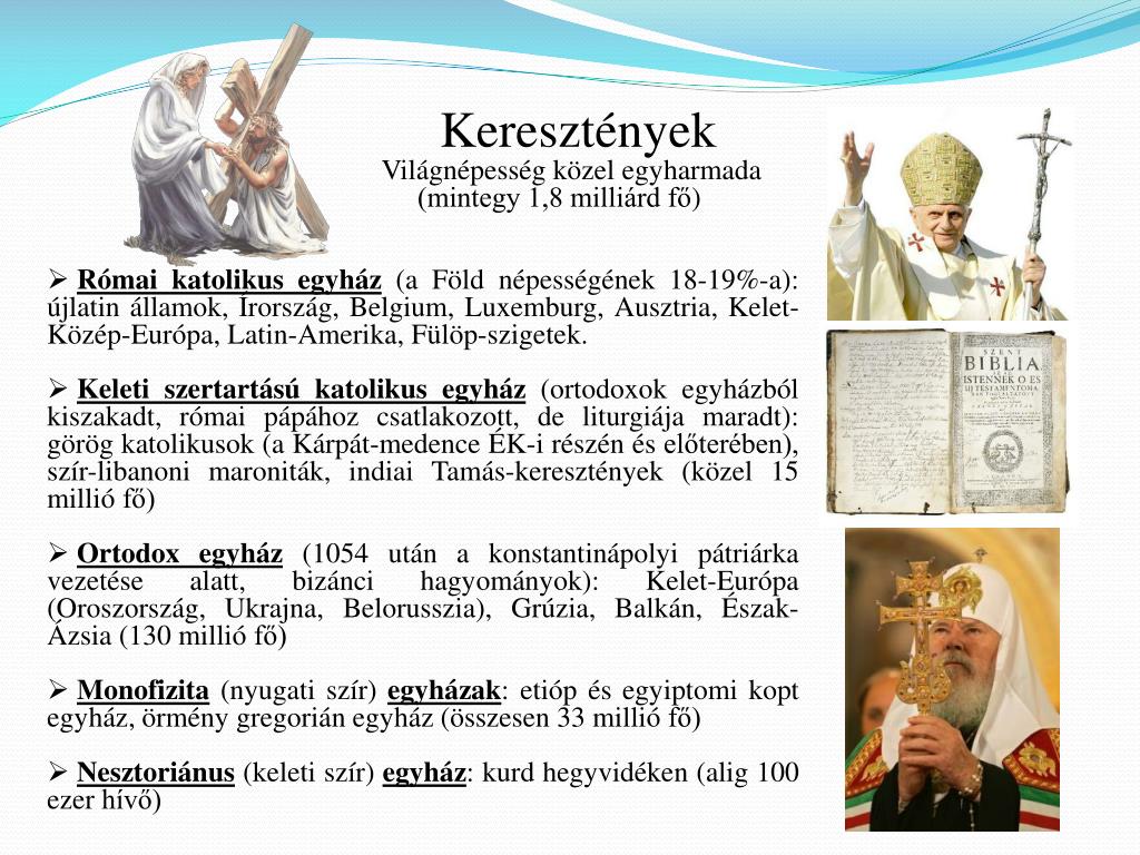 Keresztények • Világnépesség közel egyharmada • (mintegy 1,8 milliárd fő) • Római katolikus egyház (a Föld népességének 18-19%-a): újlatin államok, Írország, Belgium, Luxemburg, Ausztria, Kelet-Közép-Európa, Latin-Amerika, Fülöp-szigetek. • Keleti szertartású katolikus egyház (ortodoxok egyházból kiszakadt, római pápához csatlakozott, de liturgiája maradt): görög katolikusok (a Kárpát-medence ÉK-i részén és előterében), szír-libanoni maroniták, indiai Tamás-keresztények (közel 15 millió fő) • Ortodox egyház(1054 után a konstantinápolyi pátriárka vezetése alatt, bizánci hagyományok): Kelet-Európa (Oroszország, Ukrajna, Belorusszia), Grúzia, Balkán, Észak-Ázsia (130 millió fő) • Monofizita (nyugati szír) egyházak: etióp és egyiptomi kopt egyház, örmény gregorián egyház (összesen 33 millió fő) • Nesztoriánus (keleti szír) egyház: kurd hegyvidéken (alig 100 ezer hívő)