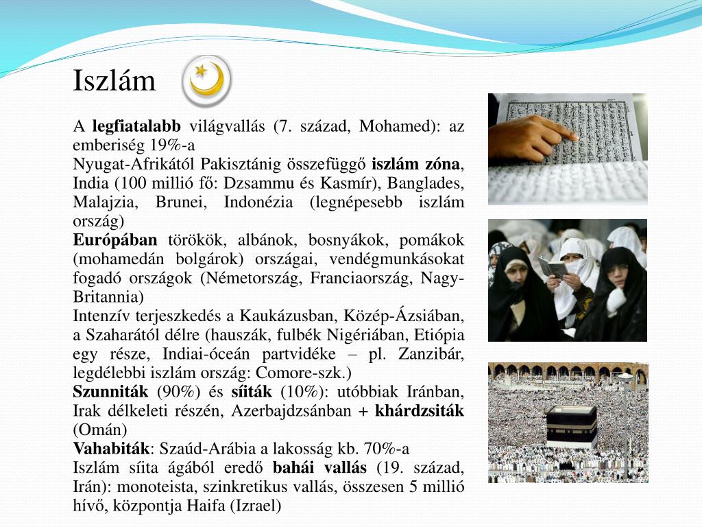 Iszlám A legfiatalabb világvallás (7. század, Mohamed): az emberiség 19%-a Nyugat-Afrikától Pakisztánig összefüggő iszlám zóna, India (100 millió fő: Dzsammu és Kasmír), Banglades, Malajzia, Brunei, Indonézia (legnépesebb iszlám ország) Európában törökök, albánok, bosnyákok, pomákok (mohamedán bolgárok) országai, vendégmunkásokat fogadó országok (Németország, Franciaország, Nagy-Britannia) Intenzív terjeszkedés a Kaukázusban, Közép-Ázsiában, a Szaharától délre (hauszák, fulbék Nigériában, Etiópia egy része, Indiai-óceán partvidéke – pl. Zanzibár, legdélebbi iszlám ország: Comore-szk.) Szunniták (90%) és síiták (10%): utóbbiak Iránban, Irak délkeleti részén, Azerbajdzsánban + khárdzsiták (Omán) Vahabiták: Szaúd-Arábia a lakosság kb. 70%-a Iszlám síita ágából eredő bahái vallás (19. század, Irán): monoteista, szinkretikus vallás, összesen 5 millió hívő, központja Haifa (Izrael)