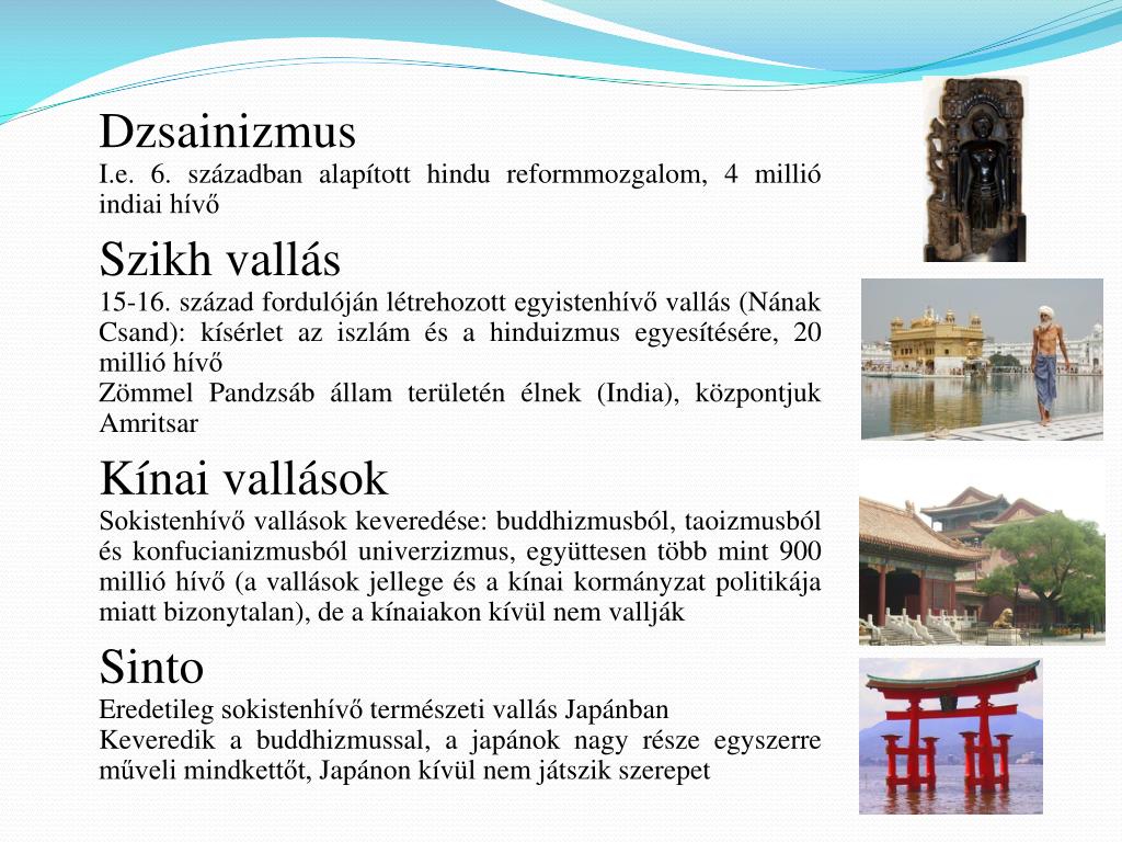 Dzsainizmus I.e. 6. században alapított hindu reformmozgalom, 4 millió indiai hívő Szikh vallás 15-16. század fordulóján létrehozott egyistenhívő vallás (NánakCsand): kísérlet az iszlám és a hinduizmus egyesítésére, 20 millió hívő Zömmel Pandzsáb állam területén élnek (India), központjuk Amritsar Kínai vallások Sokistenhívő vallások keveredése: buddhizmusból, taoizmusból és konfucianizmusból univerzizmus, együttesen több mint 900 millió hívő (a vallások jellege és a kínai kormányzat politikája miatt bizonytalan), de a kínaiakon kívül nem vallják Sinto Eredetileg sokistenhívő természetivallás Japánban Keveredik a buddhizmussal, a japánok nagy része egyszerre műveli mindkettőt, Japánon kívül nem játszik szerepet