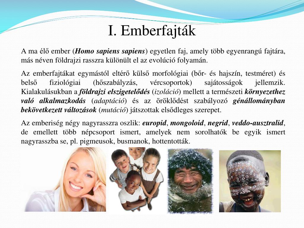 I. Emberfajták A ma élő ember (Homo sapiens sapiens) egyetlen faj, amely több egyenrangú fajtára, más néven földrajzi rasszra különült el az evolúció folyamán. Az emberfajtákat egymástól eltérő külső morfológiai (bőr- és hajszín, testméret) és belső fiziológiai (hőszabályzás, vércsoportok) sajátosságok jellemzik. Kialakulásukban a földrajzi elszigetelődés (izoláció) mellett a természeti környezethez való alkalmazkodás (adaptáció) és az öröklődést szabályozó génállományban bekövetkezett változások (mutáció) játszottak elsődleges szerepet. Az emberiség négy nagyrasszra oszlik: europid, mongoloid, negrid, veddo-ausztralid, de emellett több népcsoport ismert, amelyek nem sorolhatók be egyik ismert nagyrasszba se, pl. pigmeusok, busmanok, hottentották.