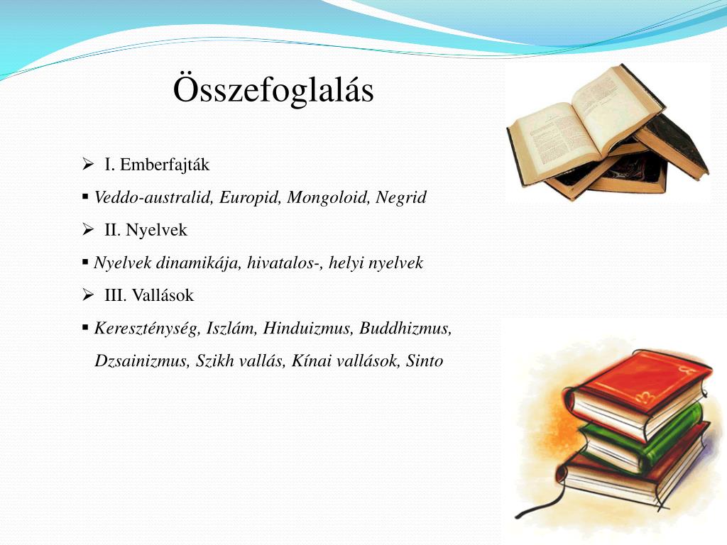 Összefoglalás • I. Emberfajták • Veddo-australid, Europid, Mongoloid, Negrid • II. Nyelvek • Nyelvek dinamikája, hivatalos-, helyi nyelvek • III. Vallások • Kereszténység, Iszlám, Hinduizmus, Buddhizmus, • Dzsainizmus, Szikh vallás, Kínai vallások, Sinto