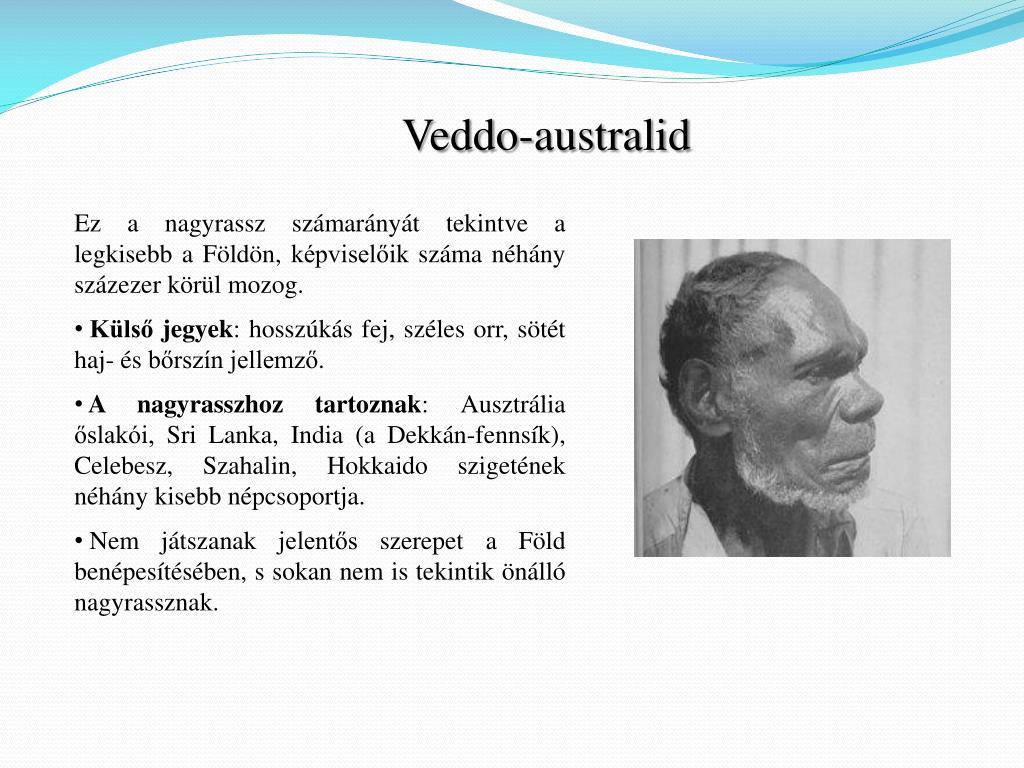 Veddo-australid • Ez a nagyrassz számarányát tekintve a legkisebb a Földön, képviselőik száma néhány százezer körül mozog. • Külső jegyek: hosszúkás fej, széles orr, sötét haj- és bőrszín jellemző. • A nagyrasszhoz tartoznak: Ausztrália őslakói, Sri Lanka, India (a Dekkán-fennsík), Celebesz, Szahalin, Hokkaido szigetének néhány kisebb népcsoportja. • Nem játszanak jelentős szerepet a Föld benépesítésében, s sokan nem is tekintik önálló nagyrassznak.