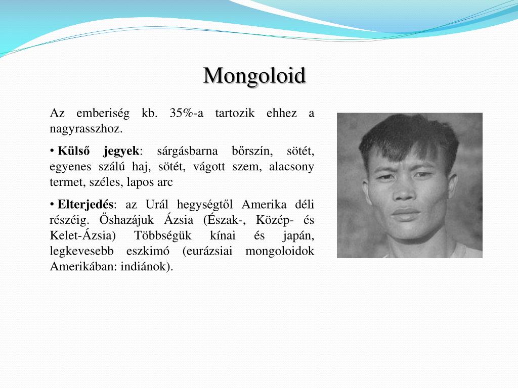 Mongoloid • Az emberiség kb. 35%-a tartozik ehhez a nagyrasszhoz. • Külső jegyek: sárgásbarna bőrszín, sötét, egyenes szálú haj, sötét, vágott szem, alacsony termet, széles, lapos arc • Elterjedés: az Urál hegységtől Amerika déli részéig. Őshazájuk Ázsia (Észak-, Közép- és Kelet-Ázsia) Többségük kínai és japán, legkevesebb eszkimó (eurázsiai mongoloidok Amerikában: indiánok).