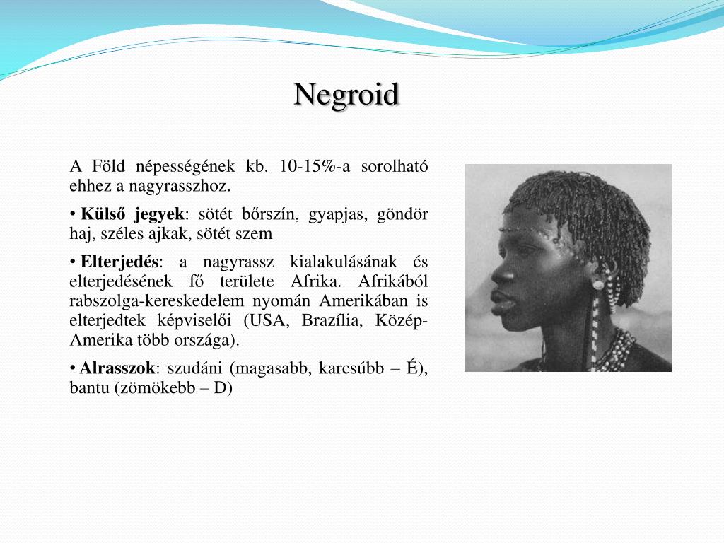Negroid • A Föld népességének kb. 10-15%-a sorolható ehhez a nagyrasszhoz. • Külső jegyek: sötét bőrszín, gyapjas, göndör haj, széles ajkak, sötét szem • Elterjedés: a nagyrassz kialakulásának és elterjedésének fő területe Afrika. Afrikából rabszolga-kereskedelem nyomán Amerikában is elterjedtek képviselői (USA, Brazília, Közép-Amerika több országa). • Alrasszok: szudáni (magasabb, karcsúbb – É), bantu (zömökebb – D)