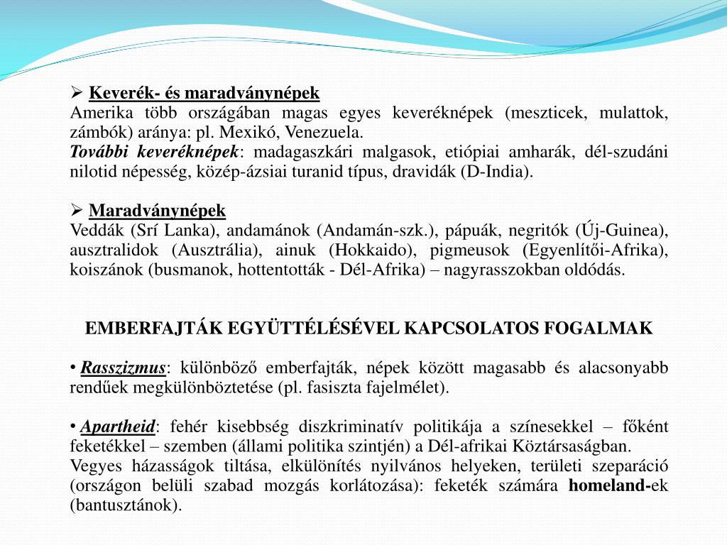 Keverék- és maradványnépek • Amerika több országában magas egyes keveréknépek (meszticek, mulattok, zámbók) aránya: pl. Mexikó, Venezuela. • További keveréknépek: madagaszkári malgasok, etiópiai amharák, dél-szudáni nilotid népesség, közép-ázsiai turanid típus, dravidák (D-India). • Maradványnépek • Veddák (Srí Lanka), andamánok (Andamán-szk.), pápuák, negritók (Új-Guinea), ausztralidok (Ausztrália), ainuk (Hokkaido), pigmeusok (Egyenlítői-Afrika), koiszánok (busmanok, hottentották - Dél-Afrika) – nagyrasszokban oldódás. • EMBERFAJTÁK EGYÜTTÉLÉSÉVEL KAPCSOLATOS FOGALMAK • Rasszizmus: különböző emberfajták, népek között magasabb és alacsonyabb rendűek megkülönböztetése (pl. fasiszta fajelmélet). • Apartheid: fehér kisebbség diszkriminatív politikája a színesekkel – főként feketékkel – szemben (állami politika szintjén) a Dél-afrikai Köztársaságban. • Vegyes házasságok tiltása, elkülönítés nyilvános helyeken, területi szeparáció (országon belüli szabad mozgás korlátozása): feketék számára homeland-ek (bantusztánok).