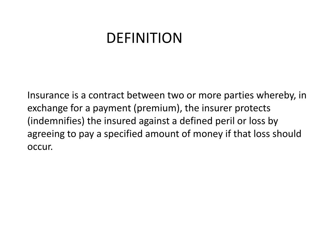 DEFINITION Insurance is a contract between two or more parties whereby, in exchange for a payment (premium), the insurer protects (indemnifies) the insured against a defined peril or loss by agreeing to pay a specified amount of money if that loss should occur.