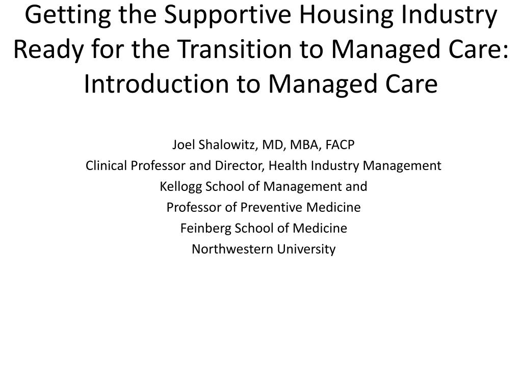 Getting the Supportive Housing Industry Ready for the Transition to Managed Care:Introduction to Managed Care Joel Shalowitz, MD, MBA, FACP Clinical Professor and Director, Health Industry Management Kellogg School of Management and Professor of Preventive Medicine Feinberg School of Medicine Northwestern University