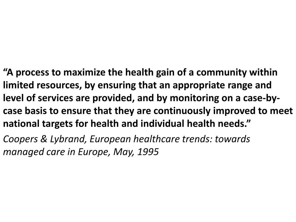 “A process to maximize the health gain of a community within limited resources, by ensuring that an appropriate range and level of services are provided, and by monitoring on a case-by-case basis to ensure that they are continuously improved to meet national targets for health and individual health needs.” Coopers & Lybrand, European healthcare trends: towards managed care in Europe, May, 1995