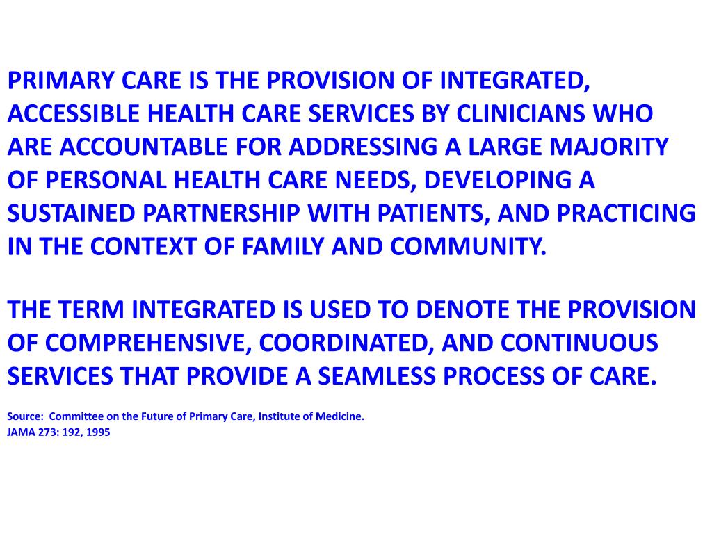 PRIMARY CARE IS THE PROVISION OF INTEGRATED, ACCESSIBLE HEALTH CARE SERVICES BY CLINICIANS WHO ARE ACCOUNTABLE FOR ADDRESSING A LARGE MAJORITY OF PERSONAL HEALTH CARE NEEDS, DEVELOPING A SUSTAINED PARTNERSHIP WITH PATIENTS, AND PRACTICING IN THE CONTEXT OF FAMILY AND COMMUNITY. THE TERM INTEGRATED IS USED TO DENOTE THE PROVISION OF COMPREHENSIVE, COORDINATED, AND CONTINUOUS SERVICES THAT PROVIDE A SEAMLESS PROCESS OF CARE. Source: Committee on the Future of Primary Care, Institute of Medicine. JAMA 273: 192, 1995