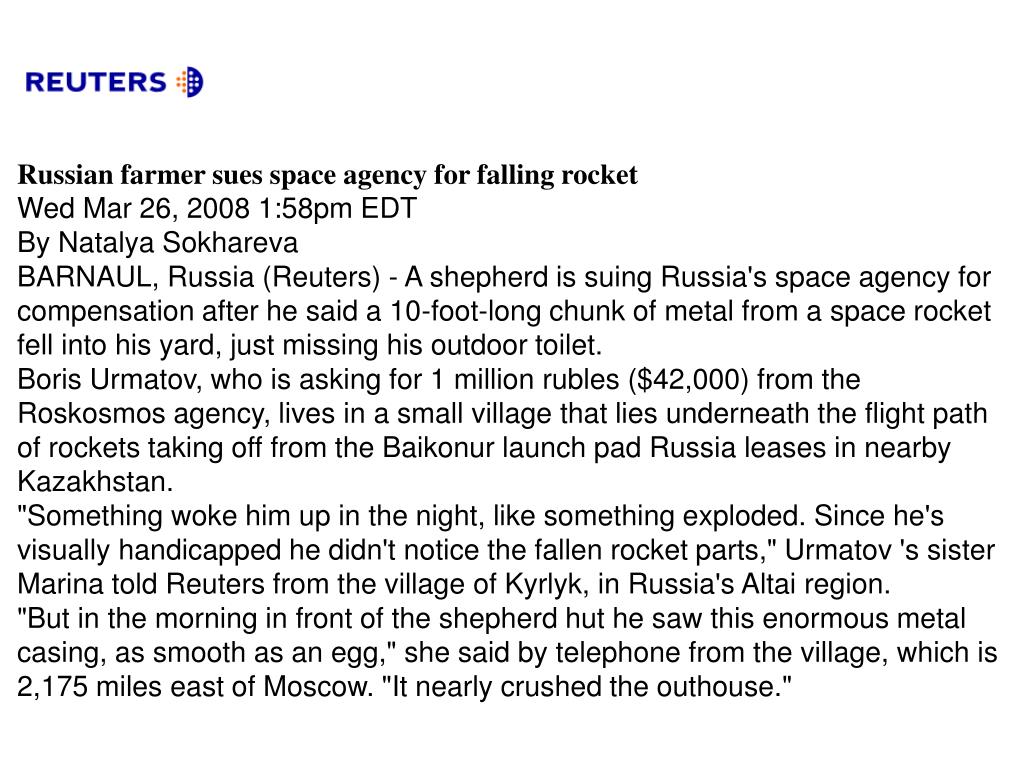 Russian farmer sues space agency for falling rocket Wed Mar 26, 2008 1:58pm EDT By Natalya Sokhareva BARNAUL, Russia (Reuters) - A shepherd is suing Russia's space agency for compensation after he said a 10-foot-long chunk of metal from a space rocket fell into his yard, just missing his outdoor toilet. Boris Urmatov, who is asking for 1 million rubles ($42,000) from the Roskosmos agency, lives in a small village that lies underneath the flight path of rockets taking off from the Baikonur launch pad Russia leases in nearby Kazakhstan. "Something woke him up in the night, like something exploded. Since he's visually handicapped he didn't notice the fallen rocket parts," Urmatov 's sister Marina told Reuters from the village of Kyrlyk, in Russia's Altai region. "But in the morning in front of the shepherd hut he saw this enormous metal casing, as smooth as an egg," she said by telephone from the village, which is 2,175 miles east of Moscow. "It nearly crushed the outhouse."