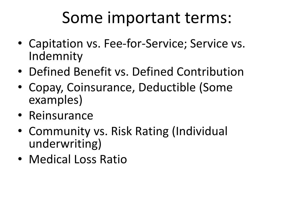 Some important terms: • Capitation vs. Fee-for-Service; Service vs. Indemnity • Defined Benefit vs. Defined Contribution • Copay, Coinsurance, Deductible (Some examples) • Reinsurance • Community vs. Risk Rating (Individual underwriting) • Medical Loss Ratio