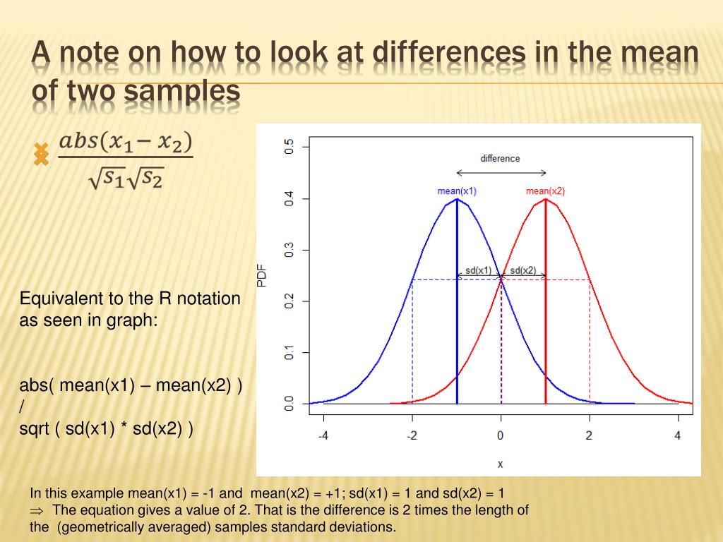 A note on how to look at differences in the mean of two samples Equivalent to the R notation as seen in graph: abs( mean(x1) – mean(x2) ) / sqrt ( sd(x1) * sd(x2) ) • In this example mean(x1) = -1 and mean(x2) = +1; sd(x1) = 1 and sd(x2) = 1 • The equation gives a value of 2. That is the difference is 2 times the length of • the (geometrically averaged) samples standard deviations.