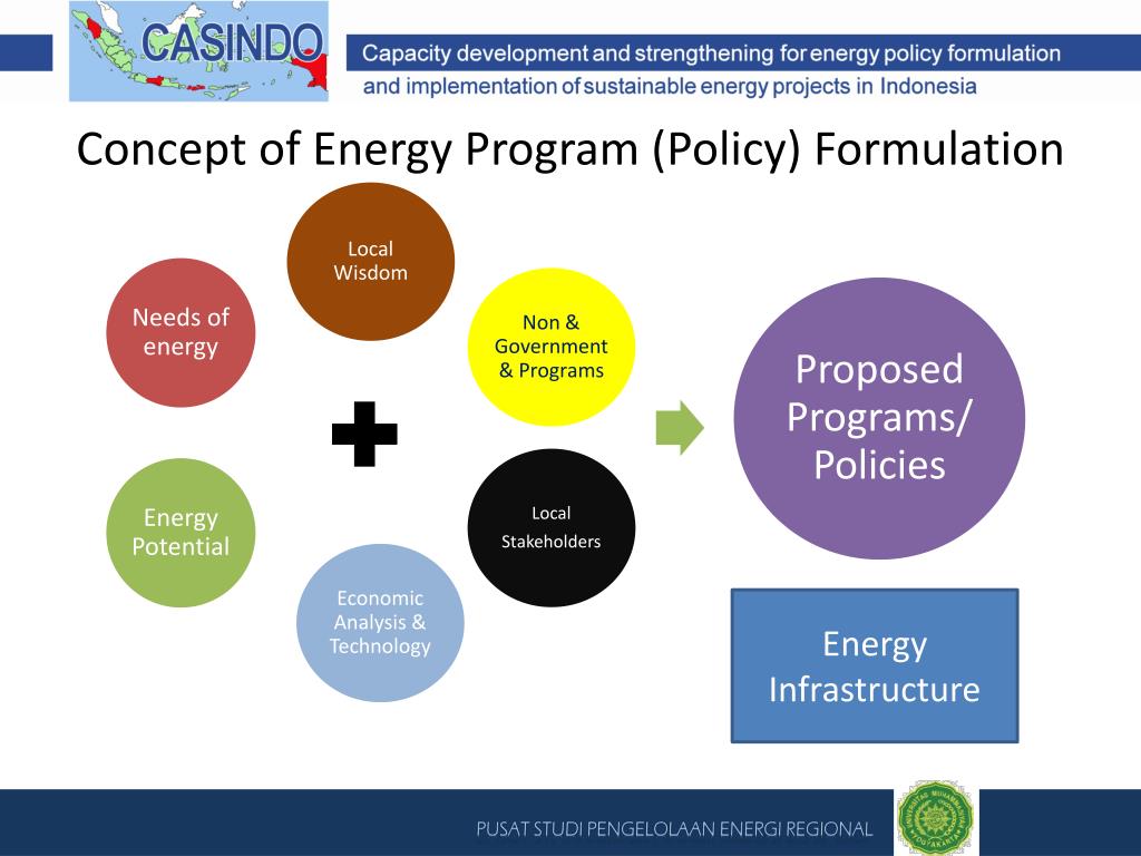 Needs of energy Proposed Programs/Policies Concept of Energy Program (Policy) Formulation Economic Analysis & Technology Local Wisdom Non & Government& Programs Local Stakeholders Energy Potential Energy Infrastructure