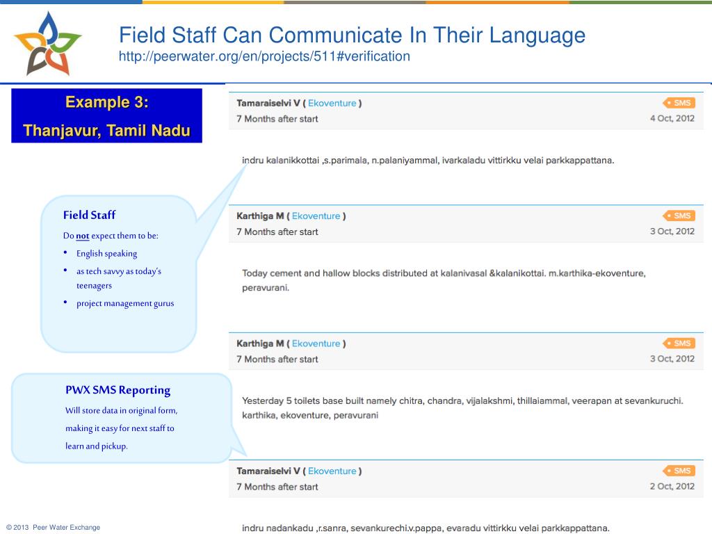 Field Staff Can Communicate In Their Languagehttp://peerwater.org/en/projects/511#verification Example 3: Thanjavur, Tamil Nadu • Field Staff • Do not expect them to be: • English speaking • as tech savvy as today’s teenagers • project management gurus PWX SMS Reporting Will store data in original form, making it easy for next staff to learn and pickup.
