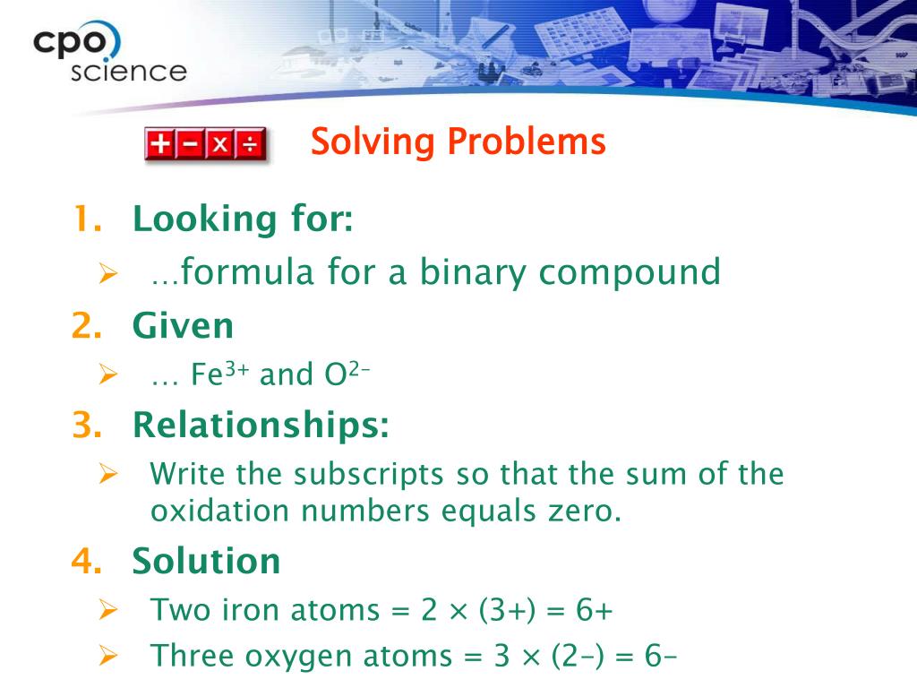 Solving Problems • Looking for: • …formula for a binary compound • Given • … Fe3+ and O2– • Relationships: • Write the subscripts so that the sum of the oxidation numbers equals zero. • Solution • Two iron atoms = 2 × (3+) = 6+ • Three oxygen atoms = 3 × (2–) = 6–
