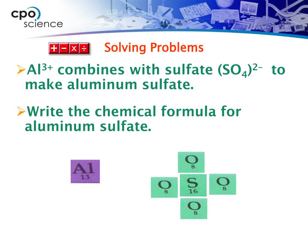 Solving Problems • Al3+ combines with sulfate (SO4)2– to make aluminum sulfate. • Write the chemical formula for aluminum sulfate.