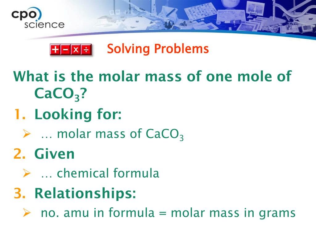 Solving Problems What is the molar mass of one mole of CaCO3? • Looking for: • … molar mass of CaCO3 • Given • … chemical formula • Relationships: • no. amu in formula = molar mass in grams