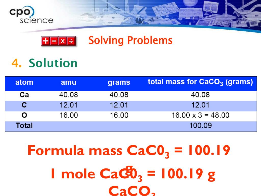 Solving Problems • Solution Formula mass CaC03 = 100.19 g 1 mole CaC03 = 100.19 g CaCO3