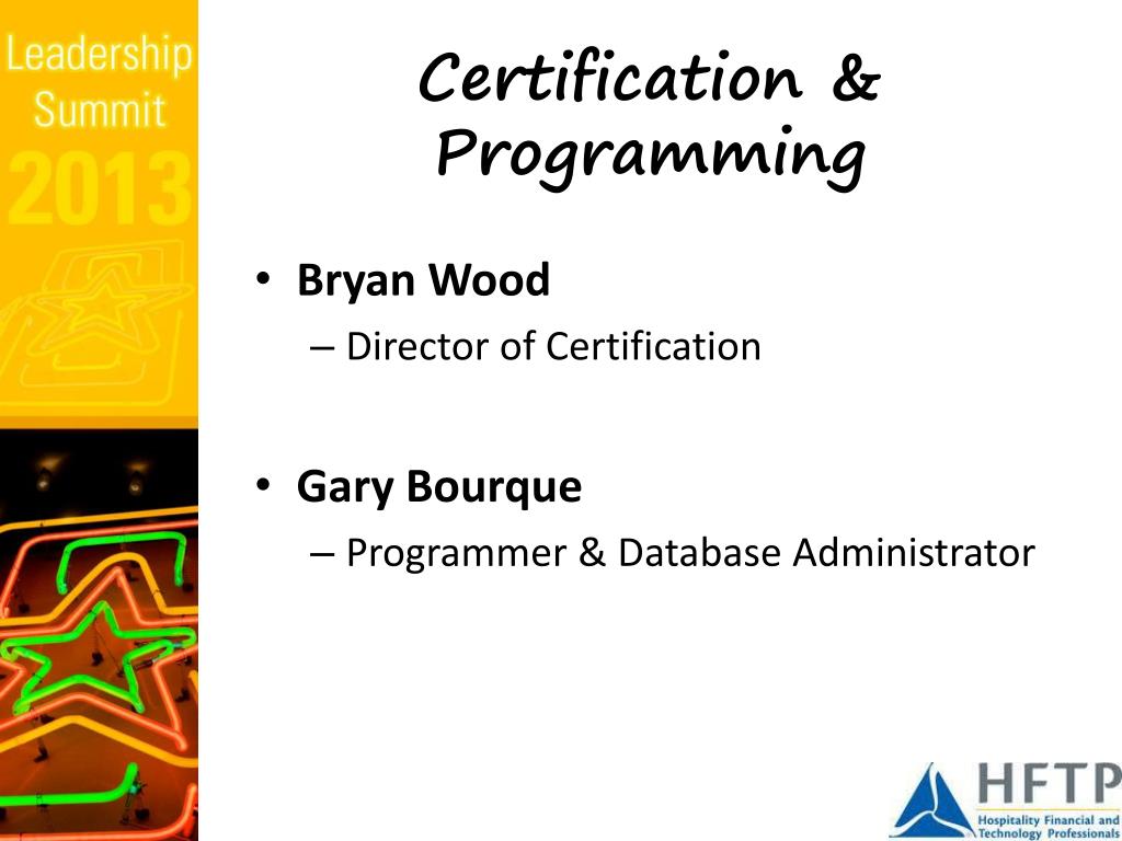 Certification & Programming • Bryan Wood • Director of Certification • Gary Bourque • Programmer & Database Administrator