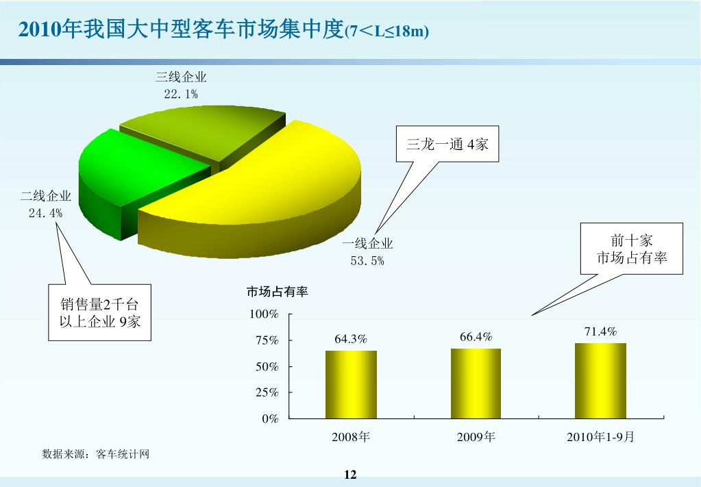 2010年我国大中型客车市场集中度(7<L≤18m) 三龙一通 4家 前十家 市场占有率 销售量2千台以上企业 9家 数据来源:客车统计网