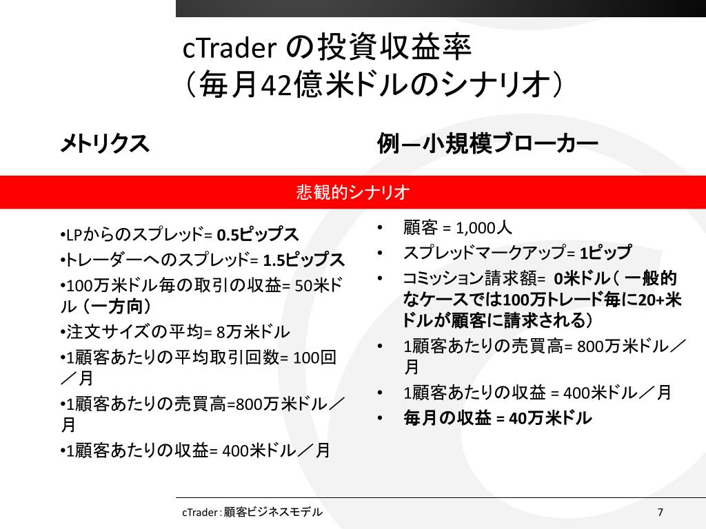 cTrader の投資収益率(毎月42億米ドルのシナリオ) メトリクス • LPからのスプレッド= 0.5ピップス • トレーダーへのスプレッド= 1.5ピップス • 100万米ドル毎の取引の収益= 50米ドル(一方向) • 注文サイズの平均= 8万米ドル • 1顧客あたりの平均取引回数= 100回/月 • 1顧客あたりの売買高=800万米ドル/月 • 1顧客あたりの収益= 400米ドル/月 例―小規模ブローカー • 顧客 = 1,000人 • スプレッドマークアップ= 1ピップ • コミッション請求額= 0米ドル( 一般的なケースでは100万トレード毎に20+米ドルが顧客に請求される) • 1顧客あたりの売買高= 800万米ドル/月 • 1顧客あたりの収益 = 400米ドル/月 • 毎月の収益 = 40万米ドル 悲観的シナリオ cTrader:顧客ビジネスモデル