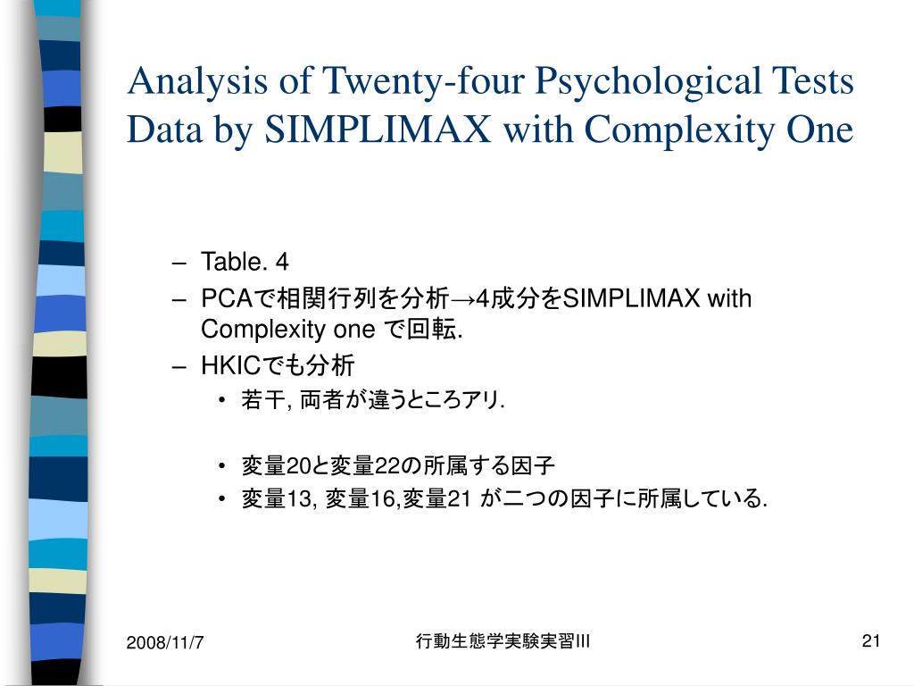 Analysis of Twenty-four Psychological Tests Data by SIMPLIMAX with Complexity One • Table. 4 • PCAで相関行列を分析→4成分をSIMPLIMAX with Complexity one で回転. • HKICでも分析 • 若干, 両者が違うところアリ. • 変量20と変量22の所属する因子 • 変量13, 変量16,変量21 が二つの因子に所属している. 行動生態学実験実習III
