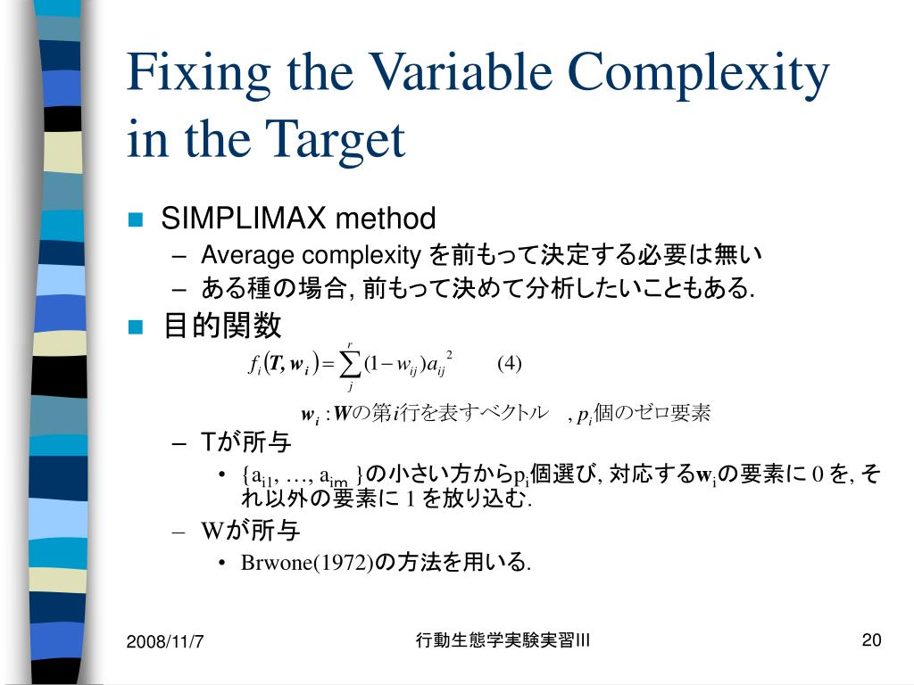 Fixing the Variable Complexity in the Target • SIMPLIMAX method • Average complexity を前もって決定する必要は無い • ある種の場合, 前もって決めて分析したいこともある. • 目的関数 • Tが所与 • {ai1, …, aim }の小さい方からpi個選び, 対応するwiの要素に 0 を, それ以外の要素に 1 を放り込む. • Wが所与 • Brwone(1972)の方法を用いる. 行動生態学実験実習III