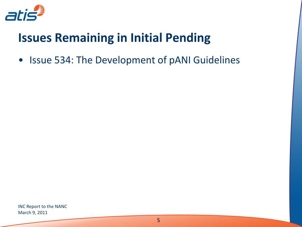 NARP Subcommittee Issue 709: Updates to the p-ANI Guidelines and Forms In December 2010, the FCC provided clarification to the PA regarding certain issues and assumptions and directed the PA to submit a Change Order for the implementation of the permanent RNA Administration function for p-ANIs. The INC accepted Issue 709 and will work with the ATIS ESIF to update the p-ANI guidelines to conform to the FCC clarifications. 4