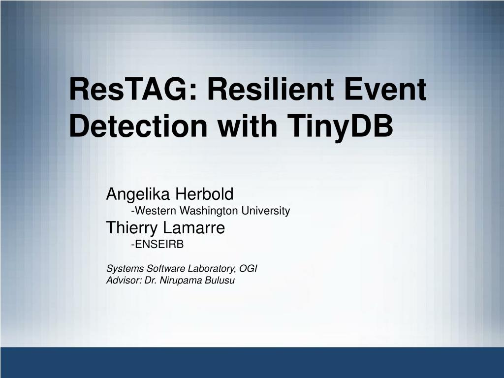 ResTAG: Resilient Event Detection with TinyDB Angelika Herbold Western Washington University Thierry Lamarre ENSEIRB Systems Software Laboratory, OGI Advisor: Dr. Nirupama Bulusu