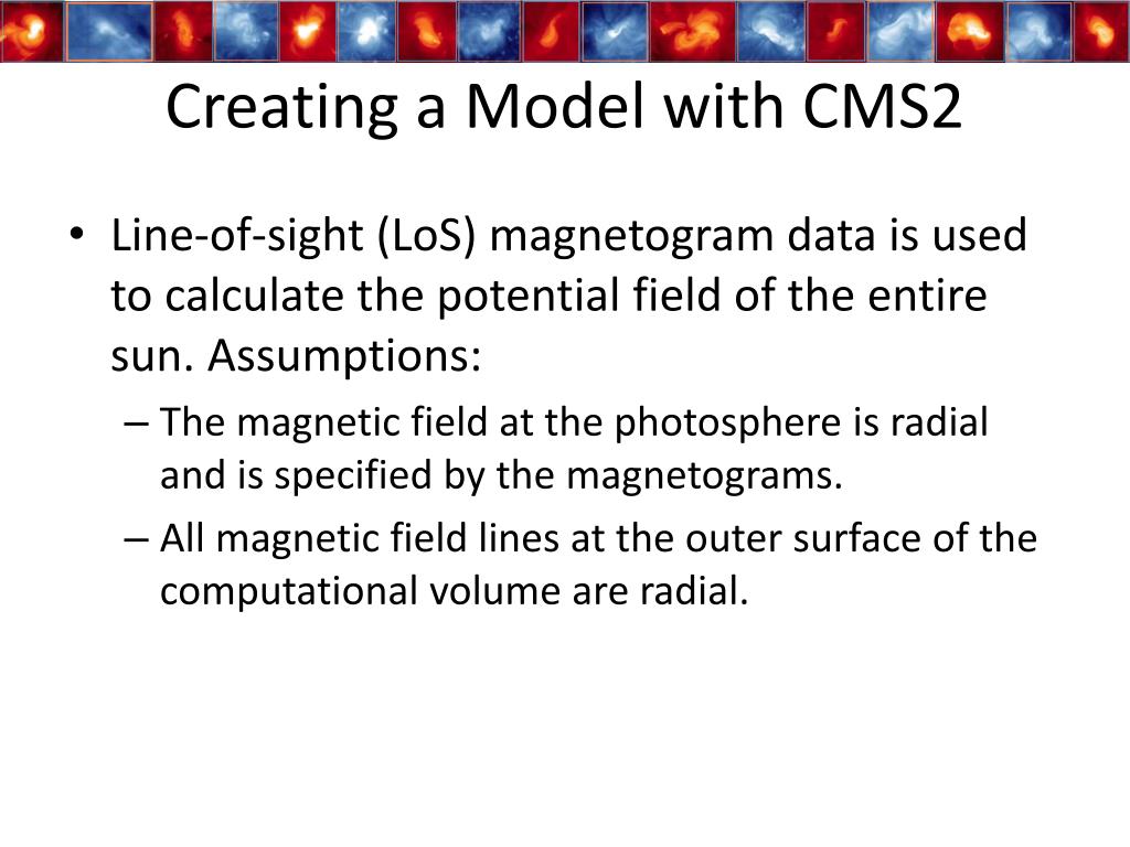Creating a Model with CMS2 • Line-of-sight (LoS) magnetogram data is used to calculate the potential field of the entire sun. Assumptions: • The magnetic field at the photosphere is radial and is specified by the magnetograms. • All magnetic field lines at the outer surface of the computational volume are radial.