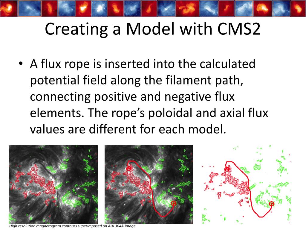 Creating a Model with CMS2 • A flux rope is inserted into the calculated potential field along the filament path, connecting positive and negative flux elements. The rope’s poloidal and axial flux values are different for each model. High resolution magnetogram contours superimposed on AIA 304Å image