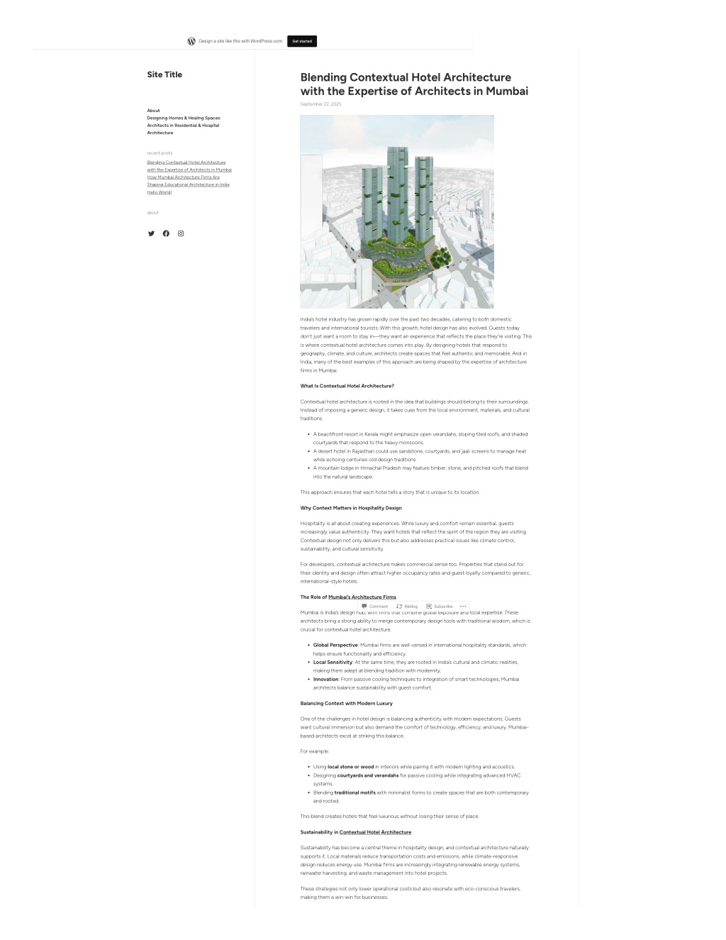 Design a site like this with WordPress.com Get started Site Title Blending Contextual Hotel Architecture with the Expertise of Architects in Mumbai September 22, 2025 About Designing Homes & Healing Spaces: Architects in Residential & Hospital Architecture recent posts Blending Contextual Hotel Architecture with the Expertise of Architects in Mumbai How Mumbai Architecture Firms Are Shaping Educational Architecture in India Hello World! about India’s hotel industry has grown rapidly over the past two decades, catering to both domestic travelers and international tourists. With this growth, hotel design has also evolved. Guests today don’t just want a room to stay in—they want an experience that reflects the place they’re visiting. This is where contextual hotel architecture comes into play. By designing hotels that respond to geography, climate, and culture, architects create spaces that feel authentic and memorable. And in India, many of the best examples of this approach are being shaped by the expertise of architecture firms in Mumbai. What Is Contextual Hotel Architecture? Contextual hotel architecture is rooted in the idea that buildings should belong to their surroundings. Instead of imposing a generic design, it takes cues from the local environment, materials, and cultural traditions. A beachfront resort in Kerala might emphasize open verandahs, sloping tiled roofs, and shaded courtyards that respond to the heavy monsoons. A desert hotel in Rajasthan could use sandstone, courtyards, and jaali screens to manage heat while echoing centuries-old design traditions. A mountain lodge in Himachal Pradesh may feature timber, stone, and pitched roofs that blend into the natural landscape. This approach ensures that each hotel tells a story that is unique to its location. Why Context Matters in Hospitality Design Hospitality is all about creating experiences. While luxury and comfort remain essential, guests increasingly value authenticity. They want hotels that reflect the spirit of the region they are visiting. Contextual design not only delivers this but also addresses practical issues like climate control, sustainability, and cultural sensitivity. For developers, contextual architecture makes commercial sense too. Properties that stand out for their identity and design often attract higher occupancy rates and guest loyalty compared to generic, international-style hotels. The Role of Mumbai’s Architecture Firms Comment Reblog Subscribe Mumbai is India’s design hub, with firms that combine global exposure and local expertise. These architects bring a strong ability to merge contemporary design tools with traditional wisdom, which is crucial for contextual hotel architecture. Global Perspective: Mumbai firms are well-versed in international hospitality standards, which helps ensure functionality and efficiency. Local Sensitivity: At the same time, they are rooted in India’s cultural and climatic realities, making them adept at blending tradition with modernity. Innovation: From passive cooling techniques to integration of smart technologies, Mumbai architects balance sustainability with guest comfort. Balancing Context with Modern Luxury One of the challenges in hotel design is balancing authenticity with modern expectations. Guests want cultural immersion but also demand the comfort of technology, efficiency, and luxury. Mumbai- based architects excel at striking this balance. For example: Using local stone or wood in interiors while pairing it with modern lighting and acoustics. Designing courtyards and verandahs for passive cooling while integrating advanced HVAC systems. Blending traditional motifs with minimalist forms to create spaces that are both contemporary and rooted. This blend creates hotels that feel luxurious without losing their sense of place. Sustainability in Contextual Hotel Architecture Sustainability has become a central theme in hospitality design, and contextual architecture naturally supports it. Local materials reduce transportation costs and emissions, while climate-responsive design reduces energy use. Mumbai firms are increasingly integrating renewable energy systems, rainwater harvesting, and waste management into hotel projects. These strategies not only lower operational costs but also resonate with eco-conscious travelers, making them a win-win for businesses.