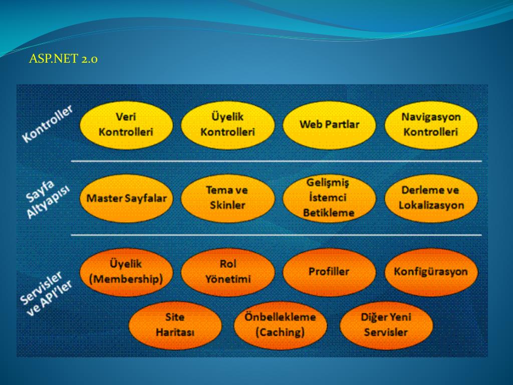 ASP .NET 2.0 ile Gelen Yenilikler • IIS’ten bağımsız çalışma • Code Snippets:Hazır kod parçaları ile daha hızlı kodlama • Server Kontrolleri:50’nin üzerinde sunucu kontrolü • MasterPages:Tek dosyadan sayfalar türetme • Temalar:Sitenin geneline uygulanabilecek tema ve şablonlar • Site Navigasyonu:Tek dosyadan tüm menü işlemleri • Veri Kontrolleri:Hızlı ve çok kolay veri işlemleri • Üyelik Kontrolleri:Hızlı ve pratik kullanıcı işlemleri • Üyelik ve Rol Yönetimleri:Kolaylaştırılmış rol yönetimleri • Web Kısımları (Webparts):Sayfaların kişiselleştirilmesi