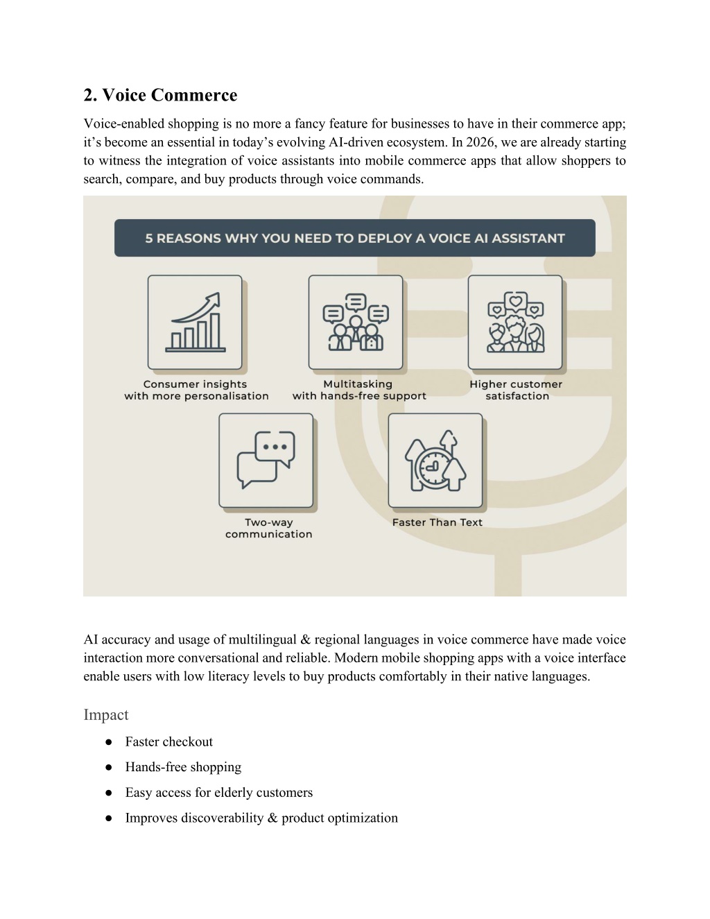 2. Voice Commerce Voice-enabled shopping is no more a fancy feature for businesses to have in their commerce app; it’s become an essential in today’s evolving AI-driven ecosystem. In 2026, we are already starting to witness the integration of voice assistants into mobile commerce apps that allow shoppers to search, compare, and buy products through voice commands. AI accuracy and usage of multilingual & regional languages in voice commerce have made voice interaction more conversational and reliable. Modern mobile shopping apps with a voice interface enable users with low literacy levels to buy products comfortably in their native languages. Impact ●Faster checkout ●Hands-free shopping ●Easy access for elderly customers ●Improves discoverability & product optimization