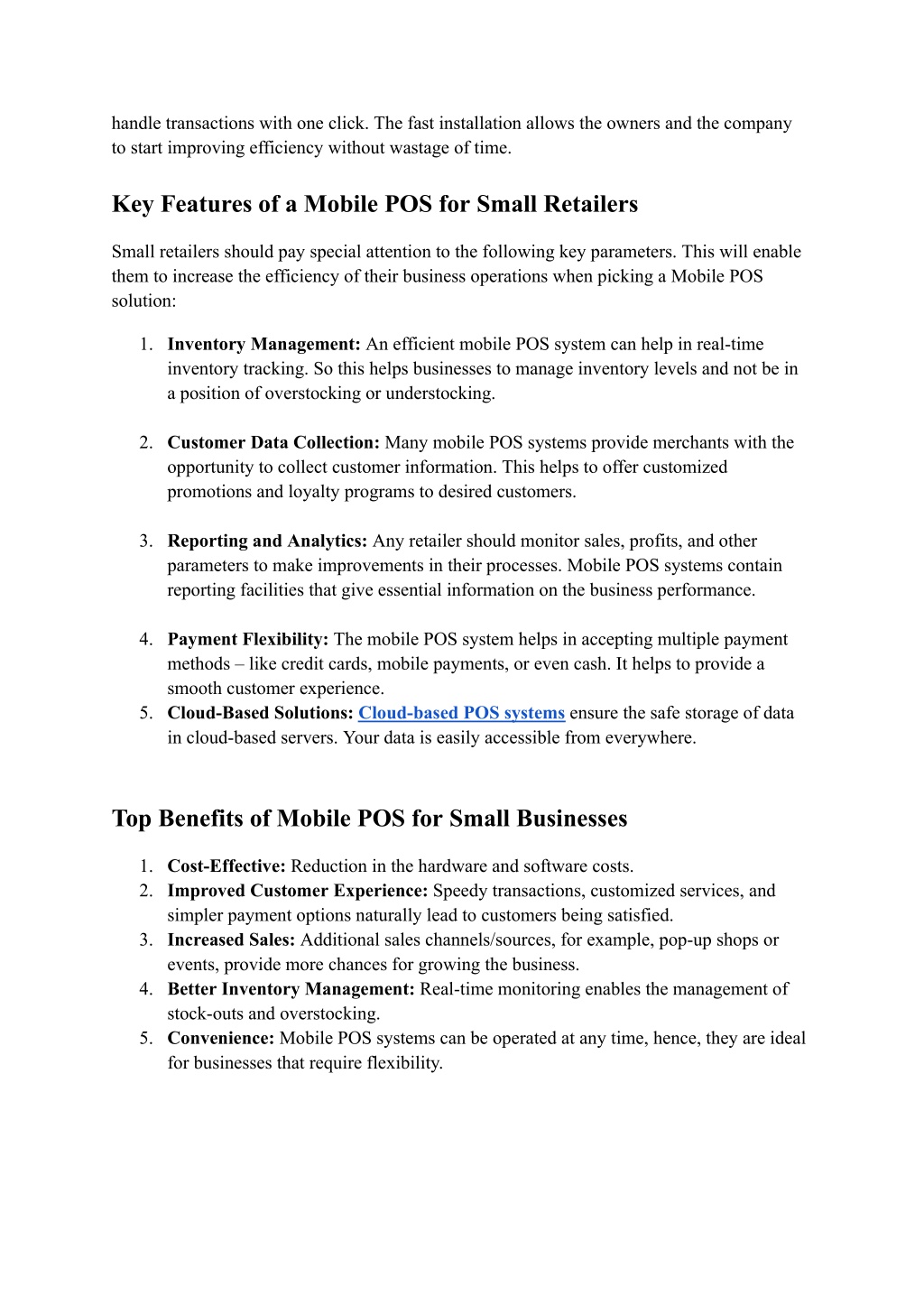 handle transactions with one click. The fast installation allows the owners and the company to start improving efficiency without wastage of time. Key Features of a Mobile POS for Small Retailers Small retailers should pay special attention to the following key parameters. This will enable them to increase the efficiency of their business operations when picking a Mobile POS solution: 1. Inventory Management: An efficient mobile POS system can help in real-time inventory tracking. So this helps businesses to manage inventory levels and not be in a position of overstocking or understocking. 2. Customer Data Collection: Many mobile POS systems provide merchants with the opportunity to collect customer information. This helps to offer customized promotions and loyalty programs to desired customers. 3. Reporting and Analytics: Any retailer should monitor sales, profits, and other parameters to make improvements in their processes. Mobile POS systems contain reporting facilities that give essential information on the business performance. 4. Payment Flexibility: The mobile POS system helps in accepting multiple payment methods – like credit cards, mobile payments, or even cash. It helps to provide a smooth customer experience. 5. Cloud-Based Solutions: Cloud-based POS systems ensure the safe storage of data in cloud-based servers. Your data is easily accessible from everywhere. Top Benefits of Mobile POS for Small Businesses 1. Cost-Effective: Reduction in the hardware and software costs. 2. Improved Customer Experience: Speedy transactions, customized services, and simpler payment options naturally lead to customers being satisfied. 3. Increased Sales: Additional sales channels/sources, for example, pop-up shops or events, provide more chances for growing the business. 4. Better Inventory Management: Real-time monitoring enables the management of stock-outs and overstocking. 5. Convenience: Mobile POS systems can be operated at any time, hence, they are ideal for businesses that require flexibility.