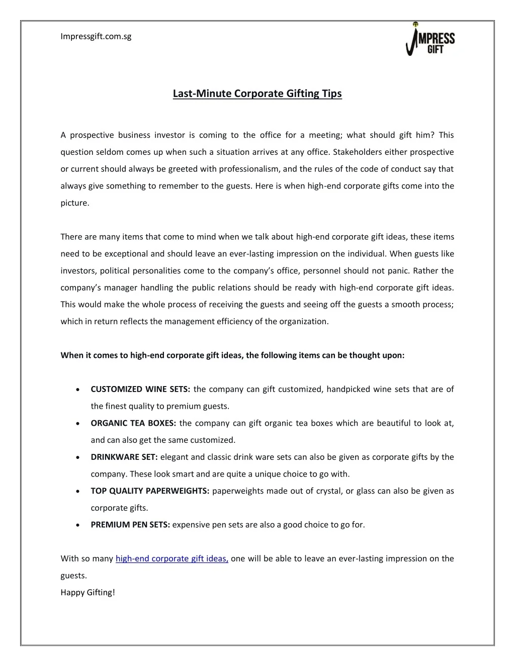 Impressgift.com.sg Last-Minute Corporate Gifting Tips A prospective business investor is coming to the office for a meeting; what should gift him? This question seldom comes up when such a situation arrives at any office. Stakeholders either prospective or current should always be greeted with professionalism, and the rules of the code of conduct say that always give something to remember to the guests. Here is when high-end corporate gifts come into the picture. There are many items that come to mind when we talk about high-end corporate gift ideas, these items need to be exceptional and should leave an ever-lasting impression on the individual. When guests like investors, political personalities come to the company’s office, personnel should not panic. Rather the company’s manager handling the public relations should be ready with high-end corporate gift ideas. This would make the whole process of receiving the guests and seeing off the guests a smooth process; which in return reflects the management efficiency of the organization. When it comes to high-end corporate gift ideas, the following items can be thought upon: CUSTOMIZED WINE SETS: the company can gift customized, handpicked wine sets that are of the finest quality to premium guests. ORGANIC TEA BOXES: the company can gift organic tea boxes which are beautiful to look at, and can also get the same customized. DRINKWARE SET: elegant and classic drink ware sets can also be given as corporate gifts by the company. These look smart and are quite a unique choice to go with. TOP QUALITY PAPERWEIGHTS: paperweights made out of crystal, or glass can also be given as corporate gifts. PREMIUM PEN SETS: expensive pen sets are also a good choice to go for. With so many high-end corporate gift ideas, one will be able to leave an ever-lasting impression on the guests. Happy Gifting!