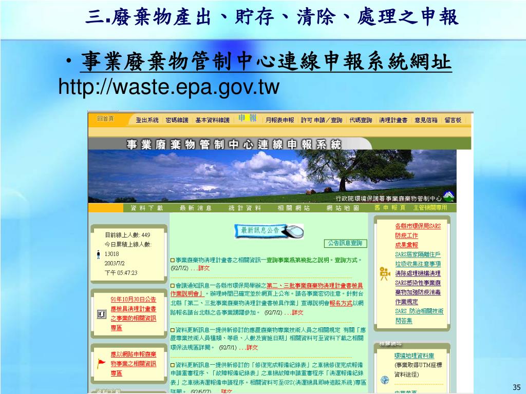 三.廢棄物產出、貯存、清除、處理之申報 • 事業廢棄物管制中心連線申報系統網址 • http://waste.epa.gov.tw