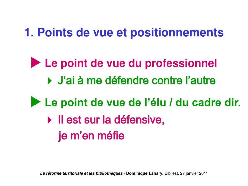 1. Points de vue et positionnements Le point de vue du professionnel Il faut convaincre l’autre Le point de vue de l’élu / du cadre dir. Il sait défendre son point de vue La réforme territoriale et les bibliothèques / Dominique Lahary. Bibliest, 27 janvier 2011
