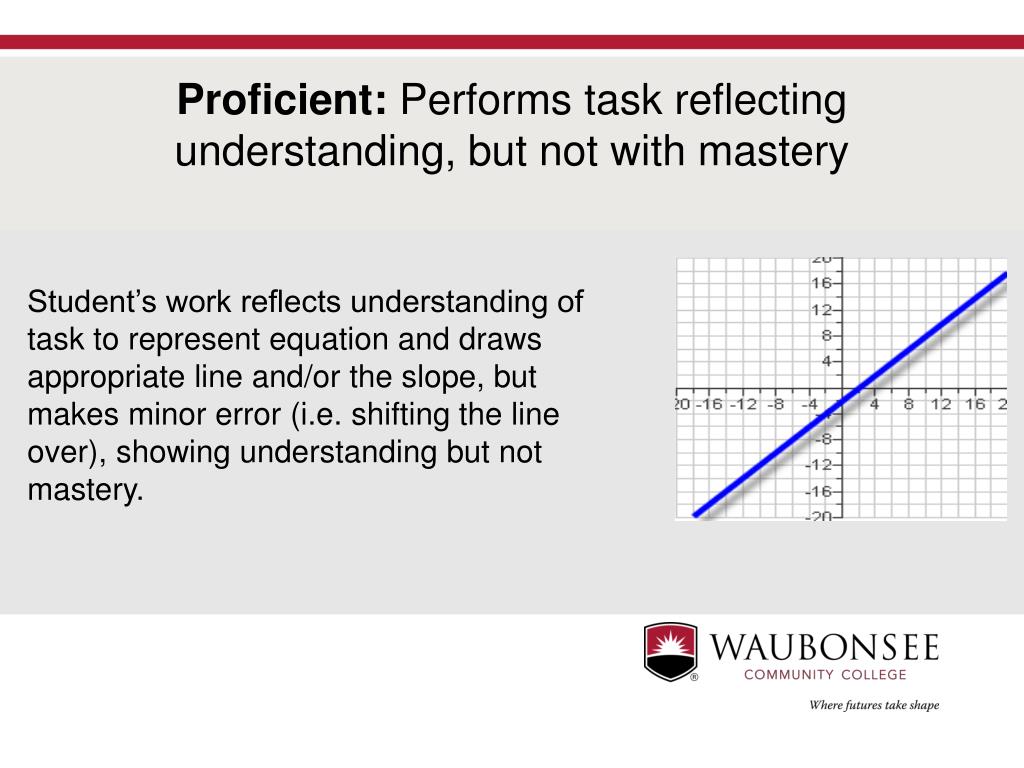 Student’s work reflects understanding of task to represent equation and draws appropriate line and/or the slope, but makes minor error (i.e. shifting the line over), showing understanding but not mastery. Proficient: Performs task reflecting understanding, but not with mastery