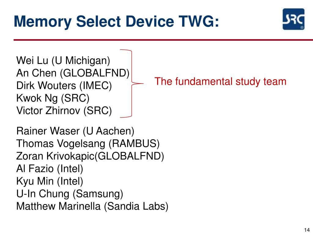 Memory Select Device TWG: Wei Lu (U Michigan)An Chen (GLOBALFND) Dirk Wouters (IMEC) Kwok Ng (SRC)Victor Zhirnov (SRC) The fundamental study team Rainer Waser (U Aachen) Thomas Vogelsang (RAMBUS) Zoran Krivokapic(GLOBALFND) Al Fazio (Intel) Kyu Min (Intel) U-In Chung (Samsung) Matthew Marinella (Sandia Labs)