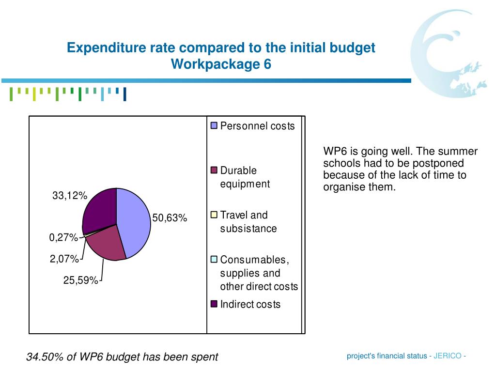 Expenditure rate compared to the initial budget Workpackage 6 WP6 is going well. The summer schools had to be postponed because of the lack of time to organise them. 34.50% of WP6 budget has been spent