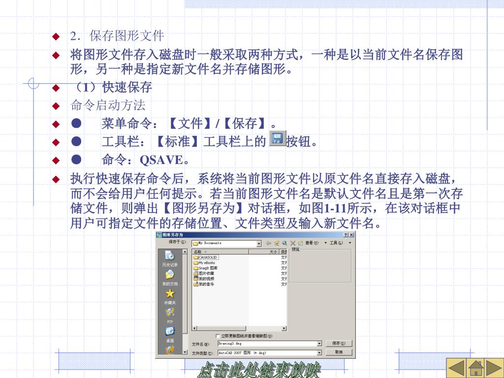 2.保存图形文件 • 将图形文件存入磁盘时一般采取两种方式,一种是以当前文件名保存图形,另一种是指定新文件名并存储图形。 • (1)快速保存 • 命令启动方法 • ● 菜单命令:【文件】/【保存】。 • ● 工具栏:【标准】工具栏上的 按钮。 • ● 命令:QSAVE。 • 执行快速保存命令后,系统将当前图形文件以原文件名直接存入磁盘,而不会给用户任何提示。若当前图形文件名是默认文件名且是第一次存储文件,则弹出【图形另存为】对话框,如图1-11所示,在该对话框中用户可指定文件的存储位置、文件类型及输入新文件名。