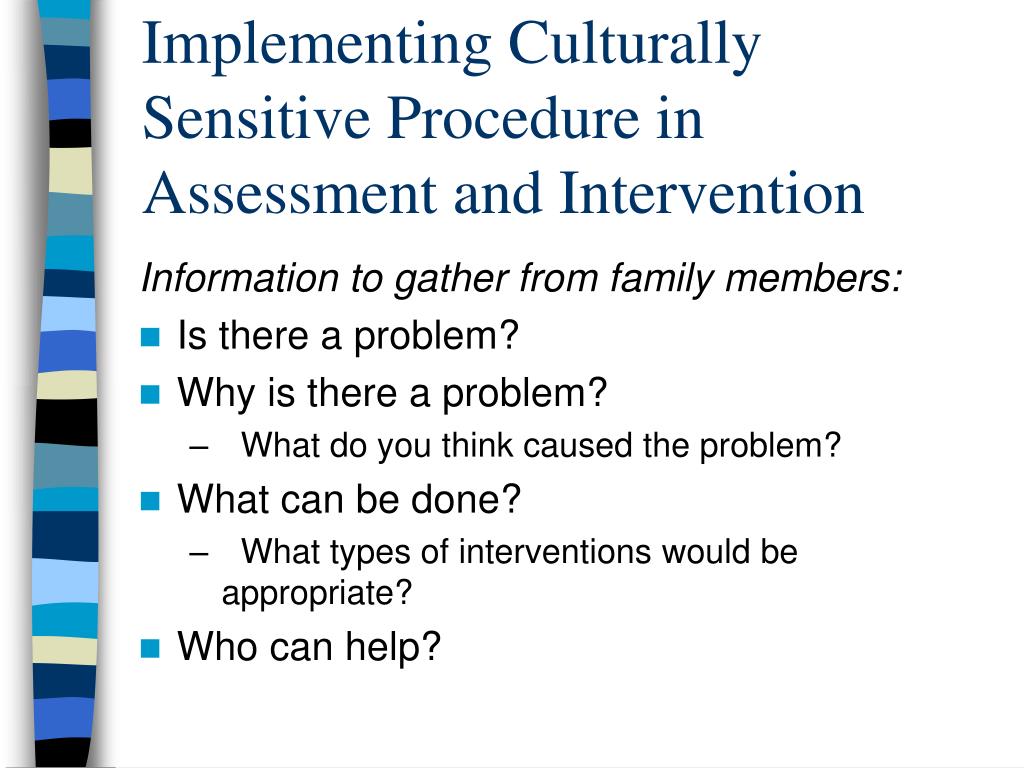 Implementing Culturally Sensitive Procedure in Assessment and Intervention Information to gather from family members: • Is there a problem? • Why is there a problem? • What do you think caused the problem? • What can be done? • What types of interventions would be appropriate? • Who can help?