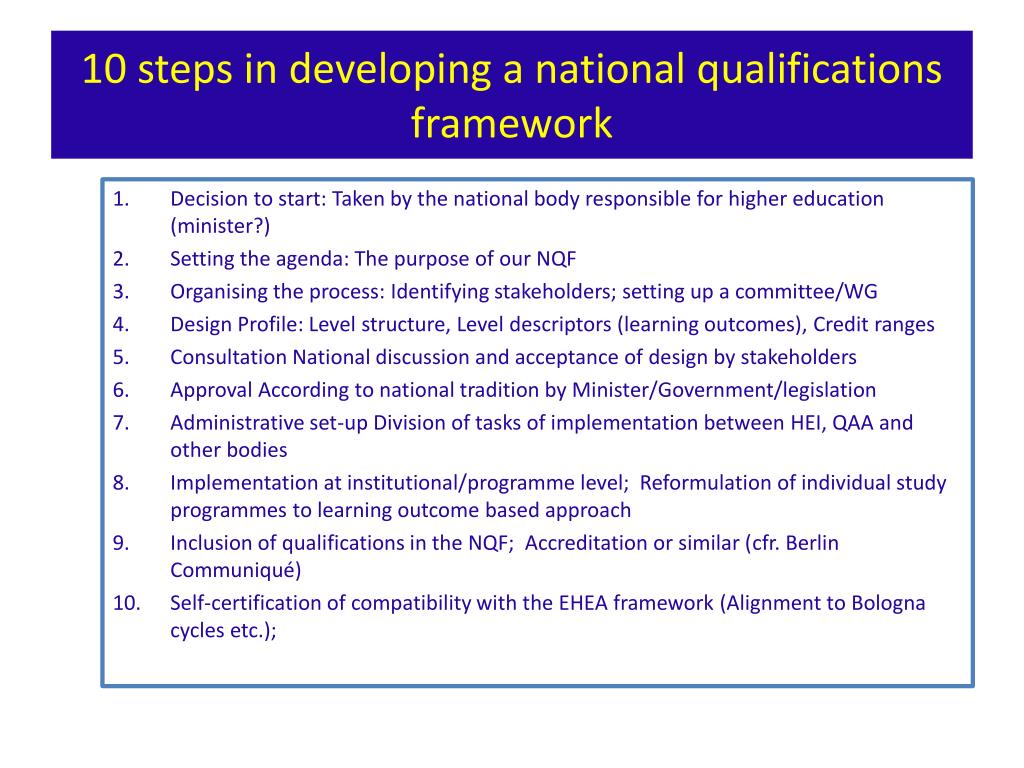 10 steps in developing a national qualifications framework • Decision to start: Taken by the national body responsible for higher education (minister?) • Setting the agenda: The purpose of our NQF • Organising the process: Identifying stakeholders; setting up a committee/WG • Design Profile: Level structure, Level descriptors (learning outcomes), Credit ranges • Consultation National discussion and acceptance of design by stakeholders • Approval According to national tradition by Minister/Government/legislation • Administrative set-up Division of tasks of implementation between HEI, QAA and other bodies • Implementation at institutional/programme level; Reformulation of individual study programmes to learning outcome based approach • Inclusion of qualifications in the NQF; Accreditation or similar (cfr. Berlin Communiqué) • Self-certification of compatibility with the EHEA framework (Alignment to Bologna cycles etc.);
