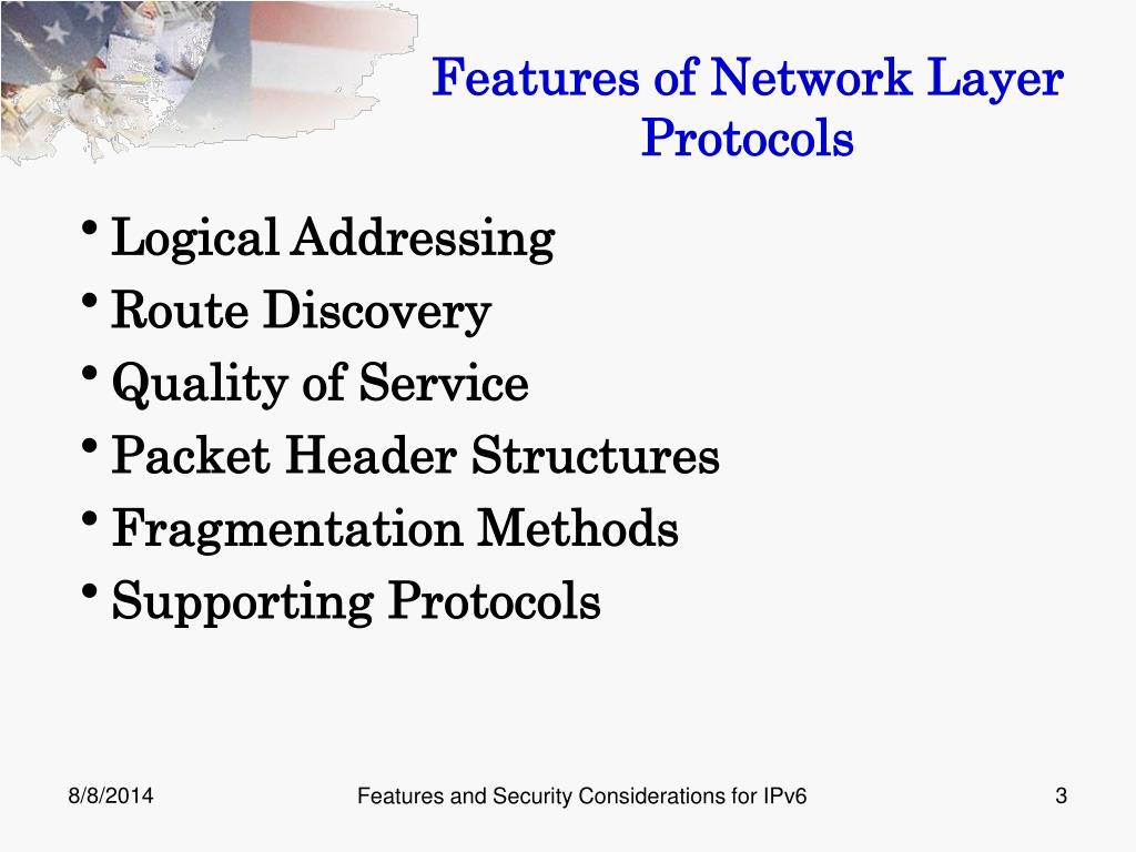 Features of Network Layer Protocols • Logical Addressing • Route Discovery • Quality of Service • Packet Header Structures • Fragmentation Methods • Supporting Protocols Features and Security Considerations for IPv6