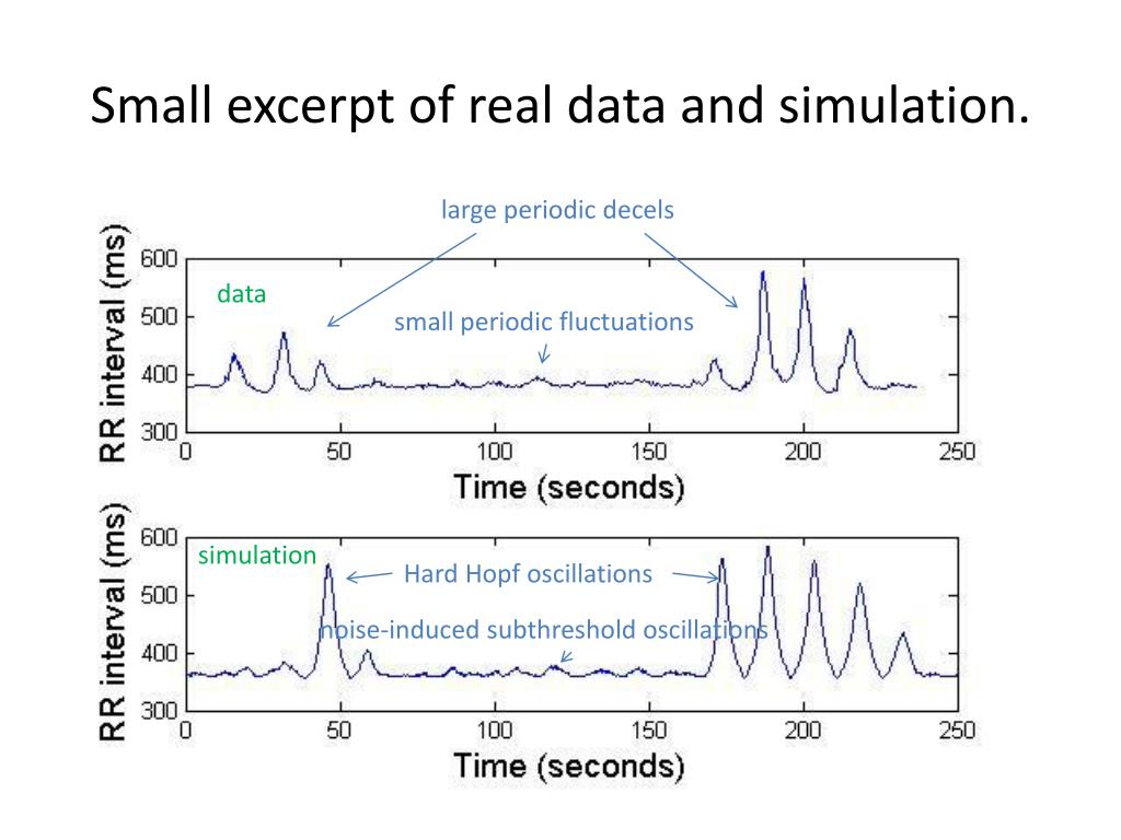 Small excerpt of real data and simulation. large periodic decels data small periodic fluctuations simulation Hard Hopf oscillations noise-induced subthreshold oscillations